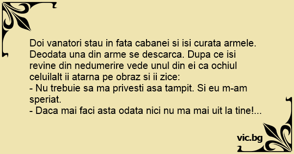 Doi vanatori stau in fata cabanei si isi curata armele. Deodata una din arme se descarca. Dupa ce isi revine din nedumerire vede unul din ei ca ochiul celuilalt ii atarna pe obraz si ii zice: