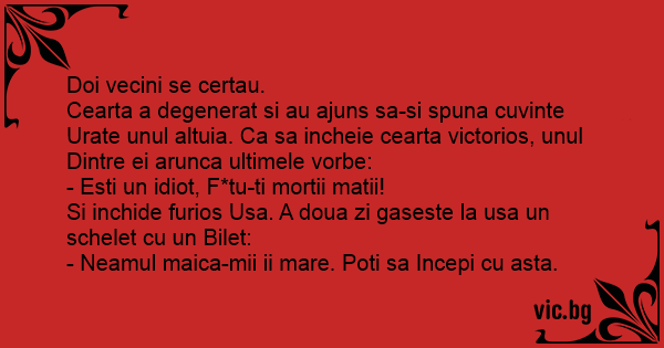 Cearta a degenerat si au ajuns sa-si spuna cuvinte Urate unul altuia. Ca sa incheie cearta victorios, unul Dintre ei arunca ultimele vorbe: