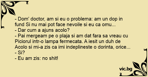 - Dom' doctor, am si eu o problema: am un dop in fund Si nu mai рот face nevoile si eu ca omu...