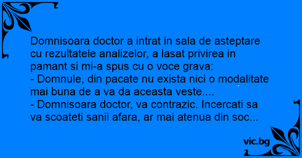 - Domnisoara doctor, va contrazic. Incercati sa va scoateti sanii afara, ar mai atenua din soc...