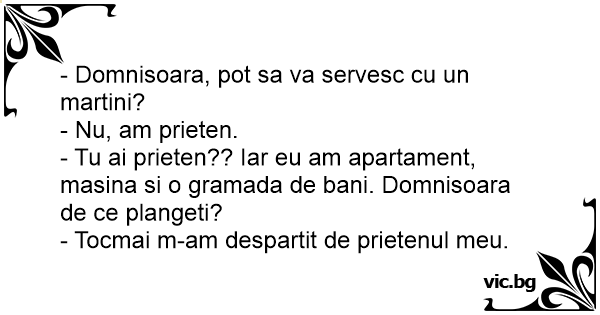 - Tu ai prieten?? Iar eu am apartament, masina si o gramada de bani. Domnisoara de ce plangeti?