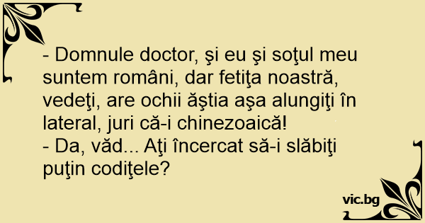- Domnule doctor, şi eu şi soţul meu suntem români, dar fetiţa noastră, vedeţi, are ochii ăştia aşa alungiţi în lateral, juri că-i chinezoaică!