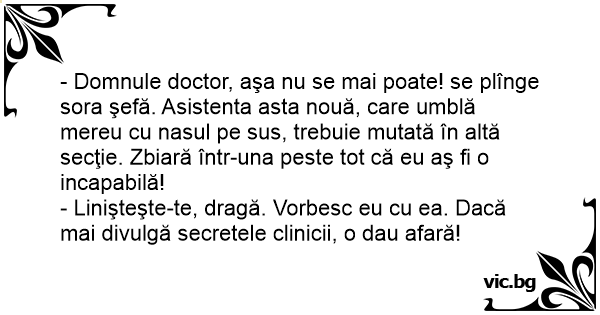 - Domnule doctor, aşa nu se mai poate! se plînge sora şefă. Asistenta asta nouă, care umblă mereu cu nasul pe sus, trebuie mutată în altă secţie. Zbiară într-una peste tot că eu aş fi o incapabilă!
