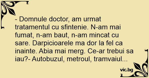 - Domnule doctor, am urmat tratamentul cu sfintenie. N-am mai fumat, n-am baut, n-am mincat cu sare. Darpicioarele ma dor la fel ca inainte. Abia mai merg. Ce-ar trebui sa iau?- Autobuzul, metroul, tramvaiul...