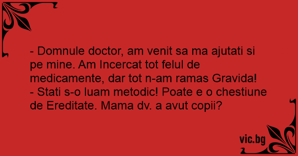 - Domnule doctor, am venit sa ma ajutati si pe mine. Am Incercat tot felul de medicamente, dar tot n-am ramas Gravida!