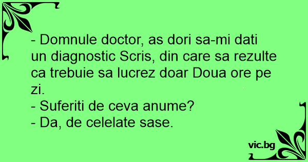 - Domnule doctor, as dori sa-mi dati un diagnostic Scris, din care sa rezulte ca trebuie sa lucrez doar Doua ore pe zi.