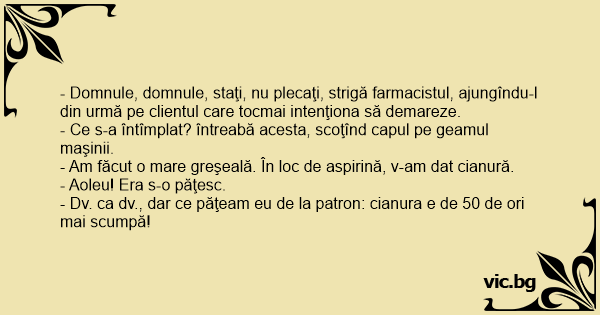 - Domnule, domnule, staţi, nu plecaţi, strigă farmacistul, ajungîndu-l din urmă pe clientul care tocmai intenţiona să demareze.