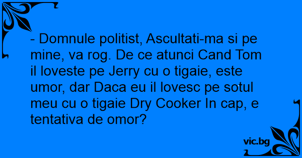 - Domnule politist, Ascultati-ma si pe mine, va rog. De ce atunci Cand Tom il loveste pe Jerry cu o tigaie, este umor, dar Daca eu il lovesc pe sotul meu cu o tigaie Dry Cooker In cap, e tentativa de omor?
