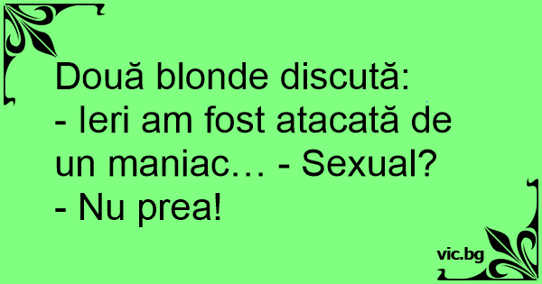 Două blonde discută:- Ieri am fost atacată de un maniac… - Sеxuаl?- Nu prea! 62 0 0 Bancuri cu blonde Bancuri despre sex