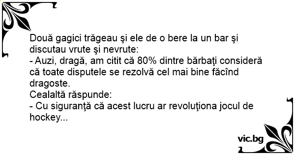 - Auzi, dragă, am citit că 80% dintre bărbaţi consideră că toate disputele se rezolvă cel mai bine făcînd dragoste.
