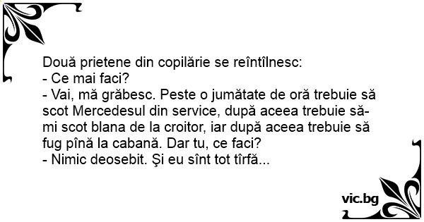 - Vai, mă grăbesc. Peste o jumătate de oră trebuie să scot Mercedesul din service, după aceea trebuie să-mi scot blana de la croitor, iar după aceea trebuie să fug pînă la cabană. Dar tu, ce faci?
