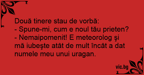 - Nemaipomenit! E meteorolog şi mă iubeşte atât de mult încât a dat numele meu unui uragan.