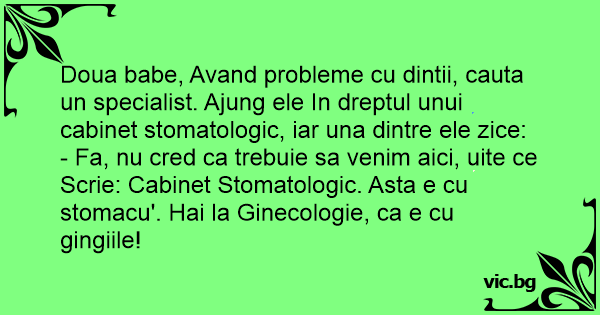 - Fa, nu cred ca trebuie sa venim aici, uite ce Scrie: Cabinet Stomatologic. Asta e cu stomacu'. Hai la Ginecologie, ca e cu gingiile!