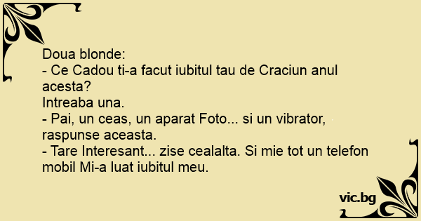 Doua blonde:<br />- Ce Cadou ti-a facut iubitul tau de Craciun anul acesta?<br />Intreaba una.<br />- Pai, un ceas, un aparat Foto... si un viвrатоr, raspunse aceasta.<br />- Tare Interesant... zise cealalta. Si mie tot un telefon mobil Mi-a luat iubitul meu.