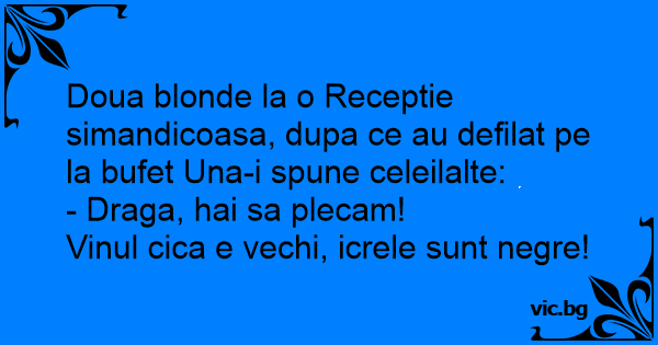 Doua blonde la o Receptie simandicoasa, dupa ce au defilat pe la bufet Una-i spune celeilalte: