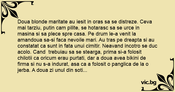 Doua blonde maritate au iesit in oras sa se distreze. Ceva mai tarziu, putin cam pilite, se hotarasc sa se urce in masina si sa plece spre casa. Pe drum le-a venit la amandoua sa-si faca nevoile mari. Au tras pe dreapta si au constatat ca sunt in fata unui cimitir. Neavand incotro se duc acolo. Cand trebuiau sa se stearga, prima si-a folosit chilotii ca oricum erau purtati, dar a doua avea bikini de firma si nu s-a indurat, asa ca a folosit o panglica de la o jerba. A doua zi unul din soti il suna pe celalat si-i spune: