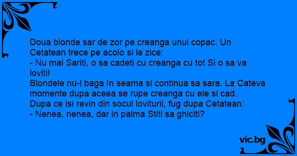 Doua blonde sar de zor pe creanga unui copac. Un Cetatean trece pe acolo si le zice: