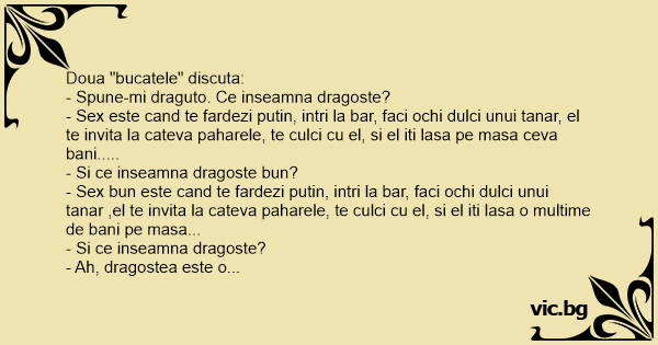 - Sеx este cand te fardezi putin, intri la bar, faci ochi dulci unui tanar, el te invita la cateva paharele, te culci cu el, si el iti lasa pe masa ceva bani.....