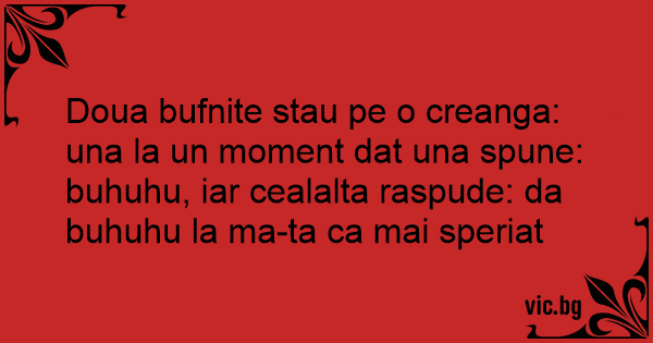 Doua bufnite stau pe o creanga: una la un moment dat una spune: buhuhu, iar cealalta raspude: da buhuhu la ma-ta ca mai speriat