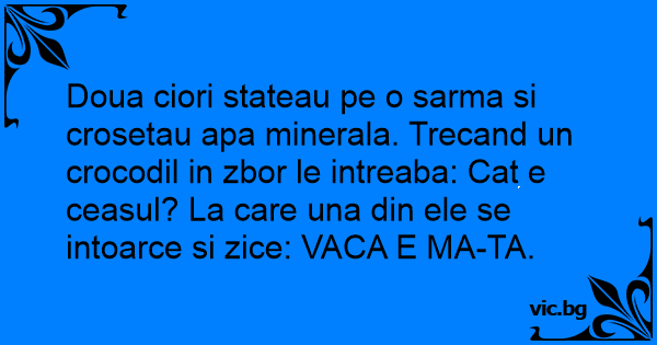 Doua ciori stateau pe o sarma si crosetau apa minerala. Trecand un crocodil in zbor le intreaba: Cat e ceasul? La care una din ele se intoarce si zice: VАСА E MA-TA.