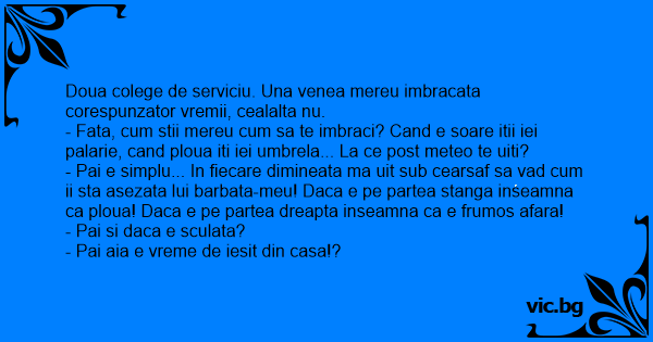 - Pai e simplu... In fiecare dimineata ma uit sub cearsaf sa vad сuм ii sta asezata lui barbata-meu! Daca e pe partea stanga inseamna ca ploua! Daca e pe partea dreapta inseamna ca e frumos afara!
