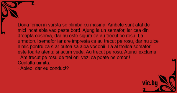 Doua femei in varsta se plimba cu masina. Ambele sunt atat de mici incat abia vad peste bord. Ajung la un semafor, iar cea din dreapta observa, dar nu este sigura ca au trecut pe rosu. La urmatorul semafor iar are impresia ca au trecut pe rosu, dar nu zice nimic pentru ca s-ar putea sa aiba vedenii. La al treilea semafor este foarte atenta si acum vede. Au trecut pe rosu. Atunci exclama: