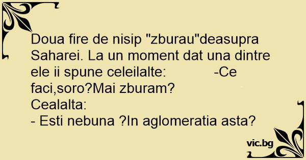 Doua fire de nisip "zburau"deasupra Saharei. La un moment dat una dintre ele ii spune celeilalte: -Ce faci,soro?Mai zburam?