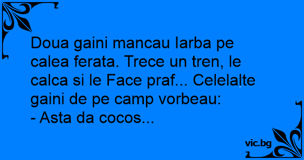 Doua gaini mancau Iarba pe calea ferata. Trece un tren, le calca si le Face praf... Celelalte gaini de pe camp vorbeau: