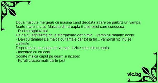 Doua maicute mergeau cu masina cand deodata apare pe parbriz un vampir, foarte mare si urat. Maicuta din dreapta ii zice celei care conducea: