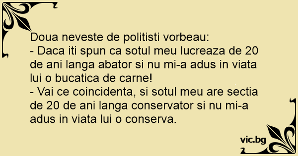 - Vai ce coincidenta, si sotul meu are sectia de 20 de ani langa conservator si nu mi-a adus in viata lui o conserva.