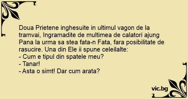 Doua Prietene inghesuite in ultimul vagon de la tramvai, Ingramadite de multimea de calatori ajung Pana la urma sa stea fata-n Fata, fara posibilitate de rasucire. Una din Ele ii spune celeilalte: