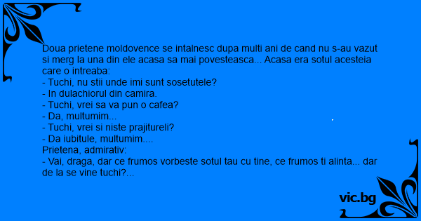 Doua prietene moldovence se intalnesc dupa multi ani de cand nu s-au vazut si merg la una din ele acasa sa mai povesteasca... Acasa era sotul acesteia care o intreaba: