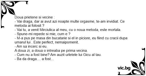 - Vai draga, dar ai avut azi noapte multe orgasme, te-am invidiat. Ce metoda ai folosit ?