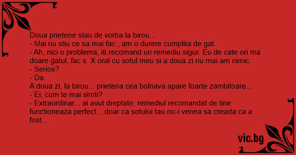 - Ah, nici o problema, iti recomand un remediu sigur. Eu de cate ori ma doare gatul, fac s. X оrаl cu sotul meu si a doua zi nu mai am nimic.