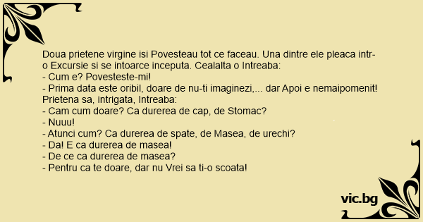 Doua prietene virgine isi Povesteau tot ce faceau. Una dintre ele pleaca intr-o Excursie si se intoarce inceputa. Cealalta o Intreaba: