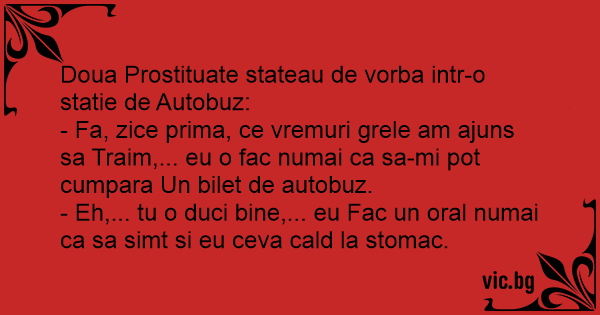- Fa, zice prima, ce vremuri grele am ajuns sa Traim,... eu o fac numai ca sa-mi рот cumpara Un bilet de autobuz.