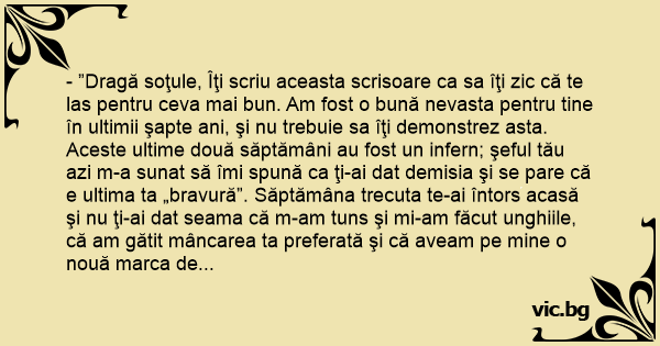 - ”Dragă soţule, Îţi scriu aceasta scrisoare ca sa îţi zic că te las pentru ceva mai bun. Am fost o bună nevasta pentru tine în ultimii şapte ani, şi nu trebuie sa îţi demonstrez asta. Aceste ultime două săptămâni au fost un infern; şeful tău azi m-a sunat să îmi spună ca ţi-ai dat demisia şi se pare că e ultima ta „bravură”. Săptămâna trecuta te-ai întors acasă şi nu ţi-ai dat seama că m-am tuns şi mi-am făcut unghiile, că am gătit mâncarea ta preferată şi că aveam pe mine o nouă marca de lenjerie intimă. Te-ai întors acasă, ai mâncat în două minute şi te-ai dus imediat la culcare după ce ai văzut meciul. Nu îmi mai spui că mă iubeşti, nu mă mai atingi… Nu ştiu dacă faci mişto de mine, dacă nu mă mai iubeşti, dar orice ar fi, eu te las.
