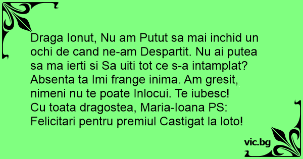 Draga Ionut, Nu am Putut sa mai inchid un ochi de cand ne-am Despartit. Nu ai putea sa ma ierti si Sa uiti tot ce s-a intamplat? Absenta ta Imi frange inima. Am gresit, nimeni nu te poate Inlocui. Te iubesc!