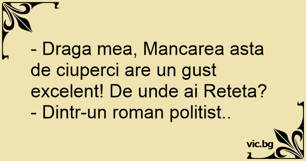 - Draga mea, Mancarea asta de ciuperci are un gust excelent! De unde ai Reteta?