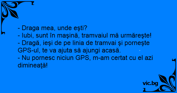 - Dragă, ieşi de pe linia de tramvai şi porneşte GPS-ul, te va ajuta să ajungi acasă.