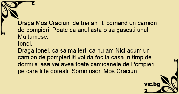Draga Ionel, ca sa ma ierti ca nu am Nici acum un camion de pompieri,iti voi da foc la casa In timp de dormi si asa vei avea toate camioanele de Pompieri pe care ti le doresti. Somn usor. Mos Craciun.