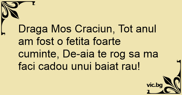 Draga Mos Craciun, Tot anul am fost o fetita foarte cuminte, De-aia te rog sa ma faci cadou unui baiat rau!