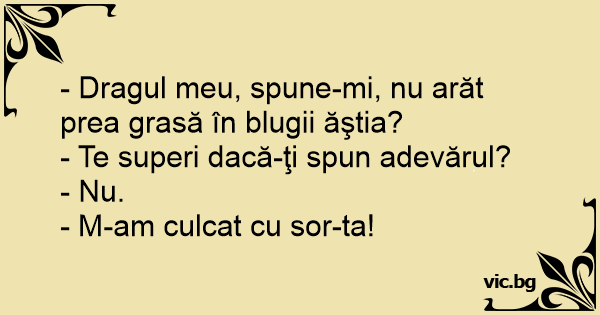 - Dragul meu, spune-mi, nu arăt prea grasă în blugii ăştia?