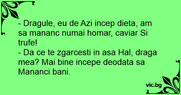 - Dragule, eu de Azi incep dieta, am sa mananc numai homar, caviar Si trufe!