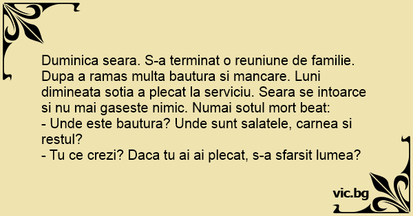 Duminica seara. S-a terminat o reuniune de familie. Dupa a ramas multa bautura si mancare. Luni dimineata sotia a plecat la serviciu. Seara se intoarce si nu mai gaseste nimic. Numai sotul mort beat: