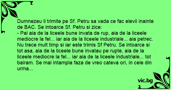 Dumnezeu il trimite pe Sf. Petru sa vada ce fac elevii inainte de BAC. Se intoarce Sf. Petru si zice: