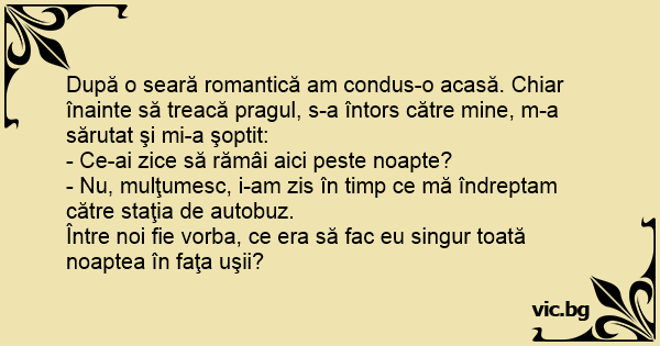 După o seară romantică am condus-o acasă. Chiar înainte să treacă pragul, s-a întors către mine, m-a sărutat şi mi-a şoptit: