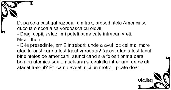 - D-le presedinte, am 2 intrebari: unde a avut loc cel mai mare atac terorist care a fost facut vreodata? (acest atac a fost facut bineinteles de americani, atunci cand s-a folosit prima oara bomba atomica sau... nucleara) si cealalta intrebare: de ce ati atacat Irak-ul? Pt. ca nu aveati nici un motiv... poate doar sa le luati petrolul... Dar se suna si presedintele nu mai are timp sa raspunda. La a doua ora intra presedintele din nou in clasa si o fetita spune: