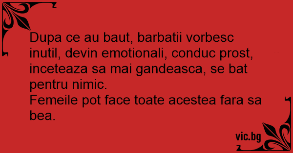 Dupa ce au baut, barbatii vorbesc inutil, devin emotionali, conduc prost, inceteaza sa mai gandeasca, se bat pentru nimic.