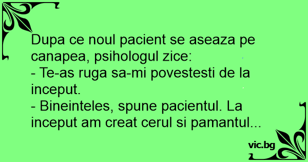 - Bineinteles, spune pacientul. La inceput am creat cerul si pamantul...